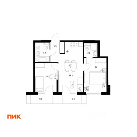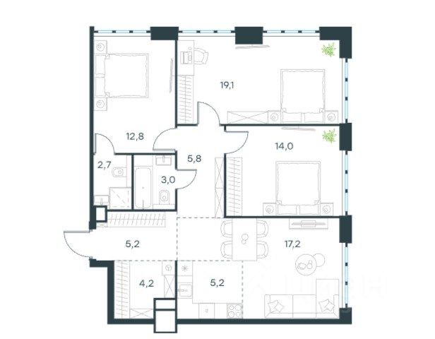 2) Кухня-гостиная, 19 кв.м.