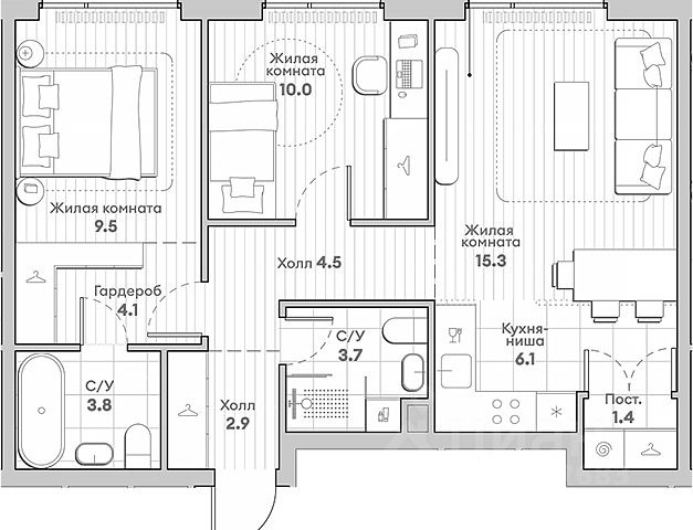 О квартире Продаётся 3-комнатная квартира общей площадью 71.3 кв.м. с отделкой white box. Квартира расположена на 12 этаже корпуса 5.3 в жилом комплексе бизнес-класса "Среда на Лобачевского" в пешей доступности от метро "Аминьевская". О жилом комплексе "Среда на Лобачевского" полностью соответствует критериям современного жилого пространства. Взяв за основу рациональный подход, мы гармонично соединили дизайн, актуальные тренды и функциональность. Продуманный современный экстерьер и функциональные планировки внутри, приватные пространства и разнообразные досуговые зоны для каждого члена семьи — все это "Среда на Лобачевского". Инфраструктура Район отлично развит и наполнен жизнью, здесь уже есть вся необходимая инфраструктура — детские сады, школы, медучреждения, торговые центры, благоустроены парки для прогулок и отдыха, удобен и легкодоступен городской транспорт. Рядом расположены учебные корпуса крупных университетов — МГУ, МГИМО и РАНХиГС. Школы и детские сады в районе занимают высокие позиции в городских рейтингах, поэтому вам не придется беспокоиться о качестве образования детей. Как и об отдыхе: поблизости расположены живописные пруды, реки и парки. Это Парк Олимпийской деревни, Парк имени 50-летия Октября, Мещерский парк и Очаковские пруды. Теперь поставить галочки в еженедельном чек-листе "спорт-прогулки-встречи с друзьями" можно, не покидая любимый район. Особенности Особое внимание в проекте уделяется созданию функциональных пространств не только внутри дома, но и за его пределами. В ландшафтном парке "Среды на Лобачевского" расположены крытые зоны для спокойного времяпровождения, места для активного отдыха и спорта, коворкинг, соседский комьюнити-центр, водные объекты. —Ландшафтный парк во дворе. —Водный сад с зонами отдыха. —Зоны коворкинга. —Дизайнерские гранд-лобби. —Бесключевой доступ. —Подземный паркинг.