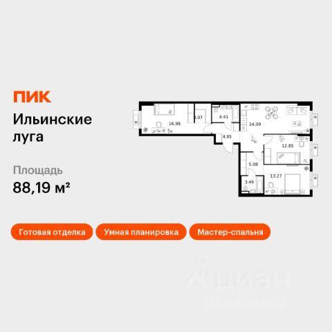 В продаже — трехкомнатная квартира с чистовой отделкой, общей площадью 102,2 кв. м. Квартира расположена на седьмом этаже шестиэтажного корпуса класса Балансд в квартале В17 нового района СберСити, который строит Сбер. Всего в доме — 102 квартиры. Архитектуру корпусов квартала разработало итальянское бюро. В облике В17 читаются черты современной голландской архитектуры: фасады домов класса Балансд облицованы ярким кирпичом и клинкерной плиткой, над первым этажом проходит декоративный пояс из фигурной кладки. Французские балкончики чередуются с широкими окнами, создавая гармоничный ритм. Во дворах — ландшафтные композиции, детские и спортивные площадки, зона для йоги, прогулочные дорожки и места отдыха. Рядом расположены детский сад, парк и набережная Москвы-реки. В квартирах предустановлена система "умный дом" — комплекс решений, объединяющий квартиру, дом и прилегающую территорию. Жильцы могут регулировать климат и освещение голосом или со смартфона, установлена защита от протечек. Проведены работы по улучшению шумоизоляции, установлены двухкамерные стеклопакеты с алюминиевым профилем и скрытыми створками. В санузлах — тёплый пол. Квартал В17 состоит из шести корпусов переменной этажности (от 1 до 10 этажей) и 491 квартиры. Корпуса объединены общей подземной частью, где расположен паркинг на 309 автомобилей, места для мотоциклов и более 400 кладовых помещений. На первом этаже дома — уютное лобби, лапомойка, колясочная и велосипедная комната. СберСити — это новый жилой и деловой район на западе Москвы, в одном из самых экологически чистых и престижных мест столицы. Это первая в России и крупнейшая в мире инновационная городская среда, созданная по международным стандартам зелёного проектирования. Здесь внедряются решения в области энергоснабжения, вакуумного мусороудаления, тестирования зелёных технологий, а в дальнейшем — системы искусственного интеллекта для управления домами и городской инфраструктурой. Строительство проекта началось в 2021 году, заселение первых корпусов — с лета 2024-го. Общая площадь территории — 461 га, из них более 2,5 млн кв. м жилья и около 833 тыс. кв. м офисных пространств. Будет построено 7 школ, 13 детских садов и 2 поликлиники. В СберСити будут жить 65 тыс. человек и работать 70 тыс. Развитием территории занимается АО "Рублёво-Архангельское", входящее в группу Сбер. СберСити — место, где хочется жить, работать и растить детей. Переезжайте в СберСити!