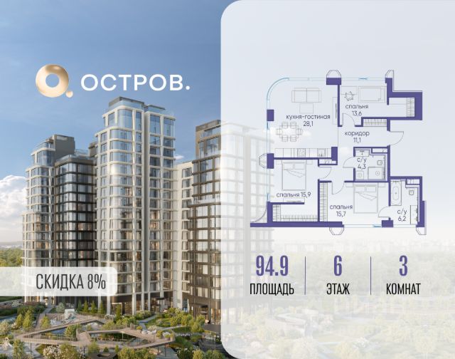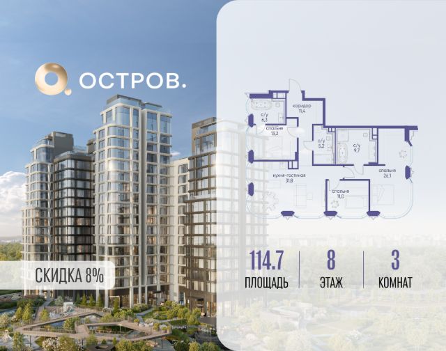 Скидка до 8% действует до 31.03.2026 г. при 100% оплате и не субсидированной ипотеке. Продаётся трехкомнатная квартира от застройщика: общая площадь 85.50 м², жилая 42.60 м², кухня 29.60 м², 18, жилой квартал "Остров 7", корпус 7 (7 квартал) (секция 1). срок сдачи: 4-кв. 2025. , 2 санузла: 2 совмещенных. В жилой зоне 2 больших окна на одну сторону, хорошая инсоляция. Позвоните сейчас и забронируйте квартиру! Купите квартиру в доме у прибрежного парка, в квартале ОСТРОВ.7. Это семь корпусов премиум- и бизнес-класса в одном из лучших мест ОСТРОВА - между бульваром и парком, поблизости от реки. Стильные корпуса имеют узнаваемый вид благодаря бионической пластике фасадов, приподнятых над землей. Для жителей предусмотрены детский клуб, фитнес-рум, коворкинг, переговорные, лаунжи. На крышах устроены видовые общественные пространства с зонами для отдыха и спорта. Двор расположен на двух уровнях: нижний ландшафтный парк и верхняя городская терраса. ОСТРОВ.7 - часть жилого комплекса на западе Москвы, в 15 минутах езды от центра. Это настоящий заповедник посреди большого города, в окружении реки и 650 га заповедников. Здесь все необходимое находится по соседству: от детского сада до супермаркета, от фитнес-зала до серфинг-центра. На территории созданы все условия для отдыха и общения: клубная инфраструктура в домах и дворы-парки, набережные и променады, маршруты для спортсменов, детей и возрастных жителей. В нескольких минутах ходьбы расположена станция метро "Терехово" БКЛ. На автомобиле - 10 минут до Москва-Сити и 15 минут до Садового кольца.