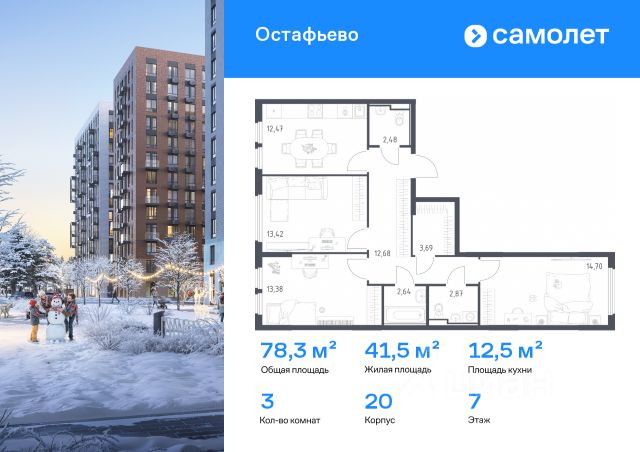 В продаже 3-комнатная квартира в корпусе 20 ЖК 'Остафьево'. Квартира располагается на 7 этаже, общая площадь 78.33 м2.