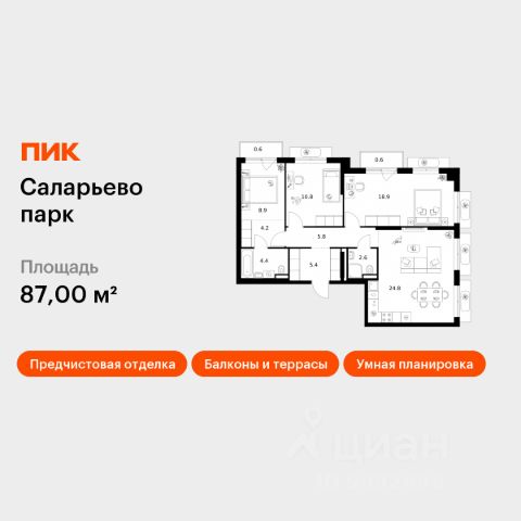 Продаётся 3-комн. квартира площадью 65,8 кв.м на 7 этаже 15 этажного дома (Корпус 57.2, Секция 2) проекта ПИК Саларьево парк. Светлый просторный подъезд на уровне земли, функциональная планировка, большие окна, предчистовая отделка. Жилой район "Саларьево парк" расположен в Новой Москве, в четырёх километрах от МКАД по Киевскому шоссе. Две станции метро: "Саларьево" и "Филатов луг", — находятся в пешей доступности от проекта. Дойти до них можно за 510 минут. В квартале уже создана качественная среда, где есть абсолютно всё для полноценной жизни, работы и отдыха. Благодаря удобному расположению проекта всё важное будет рядом: детские сады, школы, кафе и рестораны, шопинг в торговых центрах, фитнес и даже аэропорт. Все корпуса в квартале гармонично сочетаются, образуя единую городскую среду. Между собой их объединяет невысокая этажность и натуральная цветовая гамма. Здесь приятно гулять и проводить время на улице всей семьёй. В "Саларьево парке" создана уникальная образовательная среда, включающая в себя шесть школ, рассчитанных на 6 250 учеников. Две из них уже открыты, их посещает 2 300 детей. Также на территории "Саларьево парка" находится 12 детских садов, один из которых с бассейном. Сейчас уже открыты 7 садов. В "Саларьево парке" открыта уникальная игровая площадка — PlayHub "Оригами". Здесь есть ручей, горка-труба и рельефные холмы. Взрослые смогут отдохнуть в уютном кафе, пока дети играют. Также на территории проекта есть SportHub — большая спортивная зона, разделённая по интересам и возрастам. Здесь можно заниматься разными видами спорта: футболом, баскетболом, волейболом и стритболом. Зимой центральную часть площадки превращают в каток. Во дворах-парках жилого квартала есть места для отдыха, детские и спортивные площадки. На первых этажах домов расположены магазины, кафе и полезные сервисы. Также вблизи проекта есть несколько масштабных торговых центров. До ТЦ "Саларис" пять минут пешком, до "Рио", Metro Cash & Carry и "Леруа Мерлен" — пять минут на автомобиле. Артикул 1019165 (Застройщик ООО "Специализированный Застройщик "Тирон") Купить 3-комнатную квартиру с отделкой в поселении Сосенское в Москве.