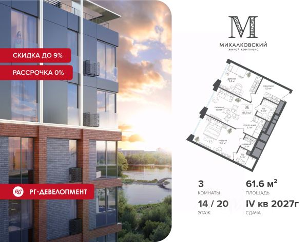 При приобретении квартиры доступна беспроцентная рассрочка с первым платежом от 30%. У покупателя также есть право воспользоваться скидкой в размере 5% от полной стоимости квартиры. - Первый платеж составляет 30% от стоимости объекта и вносится при заключении ДДУ - Второй платеж в размере 30% от стоимости объекта вносится через 6 месяцев с даты заключения ДДУ - Остаток 20% через 12 месяцев с даты заключения ДДУ, но не позднее 30.06.2027 - Остаток 20% не позднее 30.06.2027 - Действует на приобретение квартир в корп. 2, 7 Продаётся 3-к квартира 63,8 кв.м. в ЖК "Михалковский" на 10-м этаже 18 этажного дома. Скидка 9% при покупке квартиры! Ипотека для каждого! Полная стоимость кредита от 12,380% до 18,537%. Ставка от 0,11% в АО "Альфа-Банк", ген. лицензия ЦБ РФ 1326 от 16.01.2015. Ставка фиксируется на первые 12 месяцев, далее полная стоимость кредита от 22,022% до 24,599% ставка 21,59%. Первоначальный взнос — от 20,1% от стоимости квартиры. Срок кредитования — от 4 до 30 лет. Компания "РГ-Девелопмент" предоставляет скидку на квартиры в жилом комплексе. Акция действительна до 30.04.2026 включительно. Для того чтобы воспользоваться предложением, необходимо подписать договор на приобретение недвижимости до 30.04.2026 включительно. Действует программа "Растет семья - растет и квартира". Компания "РГ-Девелопмент" вошла в ТОП-10 девелоперов по объёму введённого жилья в "Старой Москве" по итогам 2025 года. Прямая продажа от застройщика! Квартиры без отделки. Срок сдачи IV кв. 2027г. Особенности проекта: Завораживающие виды Красивое благоустройство Уникальная локация для Москвы (рядом Головинский парк, пруды, усадьба Михалково) Рядом с центром В проекте присутствует: архитектура голландского бюро MLA+, зеленые зоны, транспортная доступность, благоустроенная территория, подземный паркинг, детский сад и выход на Головинский парк с пятью прудами. Название комплекса указывает на одну из его черт - соседство с имением Михалково. Позвольте себе жить в месте, где проводили свой досуг династии Дашковых и Паниных. 3-комнатная квартира первичка в районе Головинский в Москве.