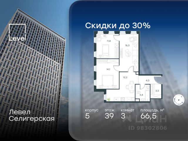 Цена указана с учётом скидки при 100%-й оплате, несубсидированной ипотеке, рассрочке (кроме программы "Рассрочка 0%"). В жилом квартале, расположенном в южной части района Западное Дегунино, продаётся 3-комнатная квартира площадью 70.50 кв.м без отделки. Квартира расположена на 33 этаже 40-этажного корпуса 3 в жилом комплексе комфорт-класса Левел Селигерская (компания Level Group/Левел групп). Отличная транспортная доступность: - 10 мин. пешком до станции метро "Верхние Лихоборы"; - 15 мин. пешком до станции метро "Селигерская"; - 20 мин. пешком до станции МЦД-3 "Моссельмаш"; - 11 мин. на авто до МКАД; - 13 мин. на авто до ТТК; - 16 мин. на авто до Садового кольца. Расположение Район отличается богатой социальной инфраструктурой: школы, детские сады, поликлиники, магазины, фитнес-клубы, торговые центры - всё близко к дому. Рядом с Левел Селигерская расположено 5 парковых зон. В 3 минутах от дома расположен перспективный сквер-парк. В 10 минутах пешком находится парк им. Святослава Фёдорова, в 13 минутах на велосипеде - парк "Ангарские пруды". В 7-11 минутах на автомобиле - два крупных природных объекта: Тимирязевский парк и Главный ботанический сад Российской академии наук. Благоустройство Внутренние дворы жилого комплекса огорожены от машин, а их функциональное наполнение отличается в зависимости от очереди строительства. На территории 2-й очереди жителей ждут уютные навесы с качелями, павильон-читальня, волейбольная площадка, беседки, а также детские и спортивные площадки. Технологии и инженерия Для входа на территорию комплекса предусмотрен единый ключ доступа. Все общественные зоны оснащены камерами видеонаблюдения, по заявке собственнику предоставляется возможность просмотра изображения отдельных видеокамер на его мобильном устройстве. При въезде в паркинг функционирует система распознавания госномеров. Кроме того, для комфорта жителей создано мобильное приложение, с помощью которого можно удаленно контролировать доступ на придомовую и жилую территории. Другие преимущества жилого комплекса - Высокая освещённость квартир: в большинстве из них не менее трёх окон; - Супермаркет, магазины, кафе, пекарни и многое другое на первых этажах домов; - Частный детский сад; - Стильные дизайнерские лобби с высокими потолками до 4,3 м. и окнами в пол, для питомцев предусмотрена лапомойка; - 30+ планировочных решений: от компактных студий до просторных семейных квартир; - С каждого этажа дома на лифте можно спуститься в подземный отапливаемый паркинг." 3-комнатная квартира первичка на проезде Ильменский в Москве.