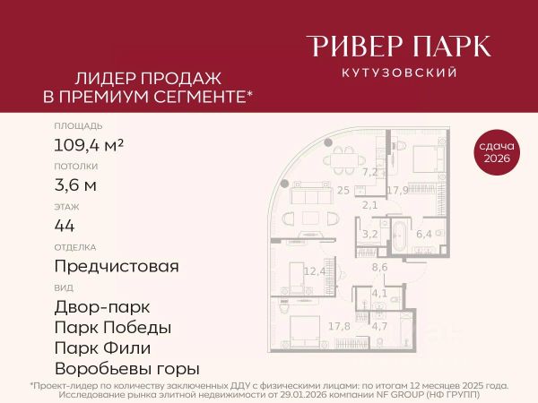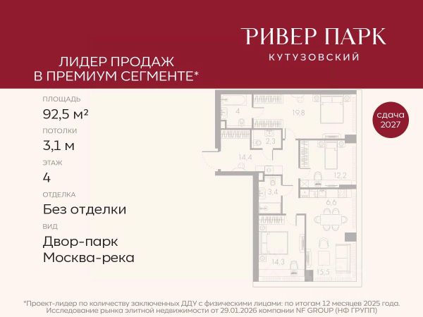 Продается 3-к квартира площадью 102.0 кв.м. на 16-м этаже в жилом комплексе премиум-класса Ривер Парк Кутузовский в Башне Лазурь Премиальный жилой комплекс Ривер Парк Кутузовский строится в одном из самых престижных районов столицы Дорогомилово, на берегу Москвы-реки с лучшими видами на Москва-Сити. Яркий проект в стиле эко-футуризма станет самым масштабным и самым высотным ЖК в локации Кутузовского проспекта. Расположение и Транспортная доступность: • На берегу Москвы-реки, напротив Москва-Сити • 600 метров до Кутузовского проспекта • Удобный съезд с ТТК • Прямой выезд на МКАД по Проспекту Багратиона. • В пешей доступности 3 станции метро: Фили, Парк Победы, Кутузовская, а также станция МЦД Фили. Архитектура от именитого бюро ADM отличается уникальной пластикой фасадов - башни словно парят в воздухе, играя гранями как драгоценные камни. Жилой комплекс состоит из 5-ти небоскребов с приватным парком 2 Га и внешней торговой галереей с открытым доступом. В закрытом внутреннем дворе уникальная по насыщенности клубная инфраструктура только для жителей: • Площадка Мультиспорт (баскетбол, футбол, воллейбол, большой теннис) • Детский игровой клуб Немо • Музыкальная студия • Клуб Гедонист с бильярдной • Студия стиля для стилистов и массажа • Гольф-симулятор • Караоке Впервые в Москве лаунж-зоны на крыше небоскребов, только для жителей: • Всесезонные беседки иглу • Джакузи • Гриль • Площадка для занятий йогой • Самые высоки качели на крыше в России • Видовые площадки Благоустройство комплекса занимает 3 гектара и разработано мировым экспертом по городским парковым ландшафтам - голландским бюро WEST8. Концепция проекта дать жителям отдохнуть от городского ритма и расслабиться среди природы. В Приватном парке уже высажены хвойные деревья-крупномеры сосны и ели. • Зеркальный пруд с арт-объектом • Две детские площадки • Точка спорта с тренажерами и турниками • Цветущий сад • Зеленый театр со сценой и проектором • Видовая зона отдыха с очагом • Солнечная терраса с лежаками На территории жилого комплекса планируется строительство коммерческого образовательного центра, включающего детский сад на 200 мест и школу на 460 мест.