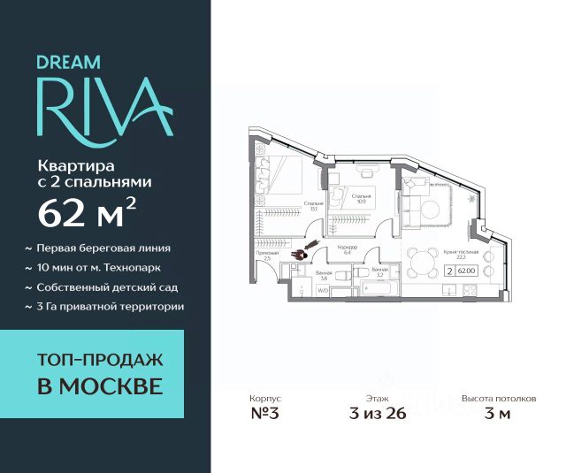 Увеличенный объем панорамного остекления создает неповторимое ощущения воздушности пространства! Двор-набережная с видами на гладь реки и кроны деревьев. Премиальный квартал DREAM RIVA — авторская архитектура в курортной концепции, воплощающей силу природных стихий в каждой детали оформления и благоустройства. Продаётся Квартира с 2 спальнями квартира на 4 этаже 26-этажного дома (3 корпус). Общая площадь: 63 кв.м. Высота потолков от 3 м. Формат приватного досуга и эксклюзивные привилегии в DREAM RIVA с приоритетным доступом для резидентов: - Первая линия Москвы-реки с открытыми видами на воду и город; - 3 Га приватного прибрежного парка с зонами для спорта и йоги; - Открытый солярий; - Школа и собственный детский сад; - Многофункциональные детские игровые площадки и детское кафе с игровой комнатой; - Клубная гостиная и lounge-бар. Локация вне конкуренции — инфраструктура полуострова предлагает всё, что нужно для размеренной жизни, работы, отдыха и развлечений: - Благоустроенная набережная с гастрогалереей; - Парк аттракционов Остров Мечты (в торговой части: рестораны, кафе, супермаркет, магазины, салон красоты, йога-студия и многое другое); - 44 Га ландшафтных парков для прогулок, спорта, пикников; - Пляжный комплекс Dream Beach Club со множеством бассейнов, ресторанов, баров и развлечений для любого возраста; - Яхт-клуб; - Вейк-парк; - Кинотеатр под открытым небом и многое другое. Удобная транспортная доступность: - Центр рядом: 15 минут до Садового кольца на авто, 20 минут до Сити или Кремля; - В 5 минутах прогулочным шагом — станция метро "Технопарк"; - Южный речной вокзал. Наши менеджеры будут рады провести для Вас консультацию и подробнее рассказать о проекте. Успейте купить на лучших условиях! Продается 3-комнатная квартира первичка в районе Нагатинский затон в Москве.