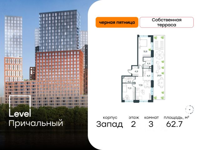 Цена указана с учётом скидки Ключи в момент покупки! В готовом жилом комплексе на набережной Москвы-реки продается 3-комнатная квартира площадью 62,7 кв.м без отделки. Квартира расположена на 2 этаже 6 этажного корпуса "Корпус Запад" в жилом комплексе бизнес-класса Level Причальный (компания Level Group/Левел групп). Отличная транспортная доступность - 7 мин. пешком до станции метро и МЦК "Шелепиха" - 5 мин. на авто до ТТК - 10 мин. на авто до Москва-Сити - 13 мин. на авто до Садового кольца Продуманный архитектурный проект - концепция создана совместно с архитектурным бюро "Остоженка" - из большинства окон открывается вид на архитектурные доминанты столицы: МГУ, Москва-Сити - высокие потолки 3,4-4,44 м в квартирах - квартиры с собственной террасой для отдыха и работы на свежем воздухе - квартиры сдаются без отделки-прекрасная возможность для создания своего уникального интерьера Технологии и безопасность - система приточной вентиляции, обеспечивающая свежий воздух в квартирах - собственные центральные водонагреватели-гарантия круглогодичной подачи горячей воды в квартиру - единый ключ доступа на всю территорию комплекса - пассажирские и сервисные лифты OTIS скоростью от 1,6 до 2,5 м/с Благоустройство Дизайн внутренней территории Level Причальный разработан в сотрудничестве со студией UpLand. Здесь спроектирован уникальный двухуровневый двор с пространством для жителей любого возраста. Концепция игрового пространства верхнего яруса-каникулы на морском побережье. Дети будут в восторге от большого скалодрома и песочницы-пляжа площадью 280 м². Также здесь находится безопасная площадка для малышей. Верхний и нижний уровни двора соединяет 90-метровый мост-пергола. Он позволит перемещаться между ярусами, а дети смогут спускаться с него по горкам. На нижнем уровне всё располагает к размеренному отдыху: прогулкам, беседам с друзьями, релаксации на шезлонгах, творческим вечерам в амфитеатре или командным активностям. Все общественные зоны жилого комплекса, включая двор и лобби, имеют доступ к сети Wi-Fi. Внутренняя инфраструктура В жилом комплексе предусмотрен собственный торговый центр с супермаркетом, фитнес-центром, магазинами, ресторанами и другими сервисами. Для жителей спроектированы просторные входные группы с большими окнами. Здесь предусмотрены мойки для лап животных и гостевые санузлы. Также в жилом комплексе доступен отапливаемый подземный паркинг на 694 машино-места и кладовые. Инфраструктура района Level Причальный расположен в районе Хорошёво-Мнёвники, одном из самых экологически чистых и престижных районов СЗАО Москвы. Он входит в территорию активно развивающегося "Большого Сити" и характеризуется развитой инфраструктурой. В 15-минутной доступности на авто-50 детских садов, 22 школы, 5 торговых центров, десятки супермаркетов и фитнес-клубов. А еще скоро Шелепихинская набережная, на которой расположен жилой комплекс, приобретет новый облик и станет одним из главных мест притяжения резидентов Level Причальный. Продается 3-комнатная квартира первичка на проезде Причальный в Москве.
