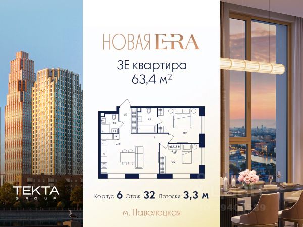 Рассрочка 0% с платежом от 250 000 ₽ в месяц. 3-комн. квартира в ЖК "Era" на 13 этаже в 37 этажном здании Корпус 6. Общая площадь: 61.5 кв.м., жилая: 40.80 кв.м. Высота потолков 3.15 м. Современный премиум-квартал ERA на Дербеневской набережной, формирующий новый архитектурный облик Даниловского района Москвы. Жилой комплекс из шести высотных корпусов выполнен в актуальной интерпретации стиля ар-деко, где ритмичные линии фасадов, натуральный мрамор и изысканные орнаменты создают гармоничный и запоминающийся образ. ERA предлагает жителям единый просторный закрытый двор. Инфраструктура двора включает разнообразные детские игровые площадки, зоны для занятий спортом (воркаут, стритбол, скалодром), а также места для спокойного отдыха — в всесезонном зеленом лабиринте или яблоневом саду. Для озеленения территории планируется высадка около 3000 деревьев и кустарников. Их сохранность обеспечат система автополива, а для комфорта в холодное время года малые архитектурные формы будут оборудованы подогревом. Вторая очередь комплекса включает три корпуса высотой от 37 до 52 этажей. Впечатляющие входные группы, разработанные бюро HAAST, встречают жителей потолками 8,8 метров. В лобби создана атмосфера уюта благодаря индивидуальной ароматизации и музыкальному сопровождению. Здесь же обустроена кофейная зона с профессиональной кофемашиной, а для дополнительного удобства установлен постамат. Высокий стандарт чистоты в любое время года обеспечивают роботы-уборщики, что подчеркивает технологичность комплекса ERA. Для комфортного подъезда такси перед каждым корпусом предусмотрены специальные drop-off зоны. Подземный паркинг на 285 мест. Ключевое преимущество — превосходная локация в развивающемся районе с готовой инфраструктурой. Всего в 5 минутах от Садового кольца, в шаговой доступности от Замоскворечья и набережной Москвы-реки, вы сможете наслаждаться динамикой городской жизни. При этом в самом комплексе на первых этажах будут работать кафе, магазины, салоны красоты и детские образовательные пространства. ERA — это гармоничный симбиоз статусного адреса, безупречного сервиса и приватности для жизни вашей мечты. 3-комнатная квартира первичка на проезде Жуков в Москве.