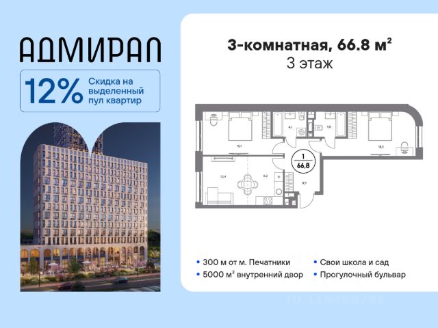 В динамично развивающемся районе Москвы, всего в 300 метрах от метро и в пешей близости от нового городского порта с протяженной набережной 13 км, свободной от автомобилей, продается 3-комнатная квартира площадью 60.00 м². без отделки. Квартира находится в корпусе жилого комплекса бизнес-класса "Адмирал", расположенного по адресу г. Москва, ул. Шоссейная, 4Д. (Застройщик - "Галс Девелопмент"). Новый амбициозный проект "Адмирал" станет частью одного из самых перспективных районов будущего - "Сити-2". В пешей доступности от современных башен Вас ждут живописные Люблинские пруды, 2 усадьбы с уникальной историей и уютный парк "Печатники" у Перервинского плёса. Район имеет отличную транспортную доступность: • 300 метров до станции метро "Печатники"; • Удобная пересадка на БКЛ и станцию МЦД-2; • 10 минут на машине до ТТК; • 15 минут до Садового кольца. Архитектура корпусов отличается динамичностью облика благодаря переменной этажности: высокие башни сочетаются с домами средней этажности. Изящным украшением становятся арочные витражи. Интеллигентный и современный стиль "Адмирала" продолжается в гранд-лобби: пастельные оттенки интерьера и фактурные элементы декора создают атмосферу безмятежного отдыха, особое ощущение простора дарят высокие потолки до 4 м и витражные окна. В домах предусмотрено от трех до шести скоростных лифтов, каждый из них спускается на любой этаж подземного паркинга и обладает удобными сенсорными панелями управления и низким уровнем шума. Благоустроенный двор площадью 5000 кв.м. украсят десятки видов гипоаллергенных растений. Здесь можно совершить приятный променад, по пути заглядывая за свежезаваренным кофе, уединиться за ноутбуком в комфортном коворкинге, занять ребенка играми в двухъярусном плейхабе или помедитировать на специальной площадке для йоги. Мягкий свет декоративных фонарей подчеркнет живописность местности, а чувство безопасности гарантируют круглосуточные системы видеонаблюдения. Дополнительные преимущества: • Высокие потолки от 2,9 до 3,25 м; • Бизнес-центр, школа и детский сад прямо на территории дома; • Подземный двухуровневый паркинг на 1955 машино-мест; • Кладовые помещения в тёплом контуре на 2м этаже; • Стрит-ритейл на первых этажах.