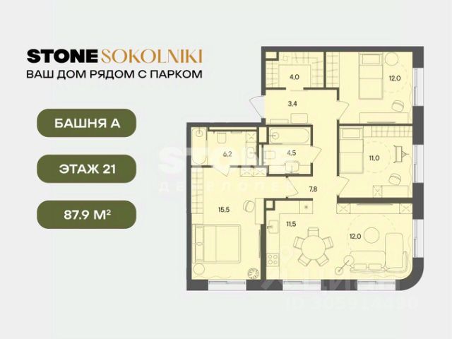 Старт продаж квартир в ЖК STONE SOKOLNIKI от девелопера STONE. В продаже просторная двуспальная квартира с кухней-гостиной и двумя спальнями для реализации любого дизайн-решения, идеально подходящая молодым парам, которые только планируют пополнение, а также небольшим семьям, где малыш уже подрастает. Современная архитектура проекта органично вписана в городскую среду. Концепция проекта разработана архитектурным бюро WALL Проект состоит из трех разновысотных башен высотой в 33, 28 и 24 этажа с чистой геометрией и увеличенной площадью остекления, которая позволит насладиться городской панорамой и видами на парк "Сокольники". Транспортная доступность - 10 мин. пешком до метро и БКЛ "Сокольники" и "Электрозаводская" - 12 мин. пешком до парка Сокольники - 10 мин. пешком до станции МЦД-3 "Митьково", которая позволит комфортно добираться в центр города и за его пределы Инфраструктура: В каждой входной группе предусмотрены помещения для временного хранения велосипедов, лапомойка, гостевой санузел, а также комната матери и ребенка. А колясочные появятся на каждом этаже - ведь это самое удобное решение для детей и их родителей. Планировочные решения: Планировки квартир в STONE Sokolniki создавались с учетом разнообразия современных сценариев жизни в городе. В проекте предусмотрены просторные кухни-гостиные, изолированные спальни с мастер-блоком, планировки для семей со взрослыми детьми, с двумя детьми разных возрастов. Благодаря грамотному зонированию квартир можно насладиться и временем с семьей, и уединением или, наоборот, устроить вечеринку вместе с друзьями. - Квартиры от 28 до 135 кв. м. Детский сад во дворе дома: Девелопер STONE осуществляет самостоятельный поиск оператора для детского сада, так как курирует наполнение проекта. На этапе финальной готовности будет выбран лучший оператор, отвечающий запросам качества и цены. Во всех своих проектах девелопер берет на себя ответственность за сдачу части помещений. Удобное хранение: В проекте STONE Sokolniki предусмотрена максимальная обеспеченность кладовыми. Хранения велосипедов в подземном паркинге возможно в зимний период, а летом будет организовано временное хранение на улице. Колясочные есть на каждом этаже всех трех жилых башен. - Колясочные на этаже - Кладовые для хранения Безопасная собственная территория дома, сим и паркинг: Внутри двора комфортно перемещаться пешком, все въезды в паркинг организованы по внешнему периметру. Велосипеды, самокаты и электросамокаты, детские беговелы и коляски - в приоритете, для всех колесных видов транспорта продуманы удобные маршруты движения и варианты хранения в разные сезоны. STONE - девелопер коммерческой и жилой недвижимости классов бизнес и премиум в Москве с 19-летним опытом. С 2022 года занимает лидирующую позицию на офисном рынке (рейтинг РБК). Сегодня в портфеле девелопера представлено 3 млн кв. м построенных, строящихся и проектируемых объектов, из которых более 1 млн кв. м находятся в стадии строительства. Компания имеет самый масштабный пр Продам 3-комнатную квартиру первичка в районе Сокольники в Москве.