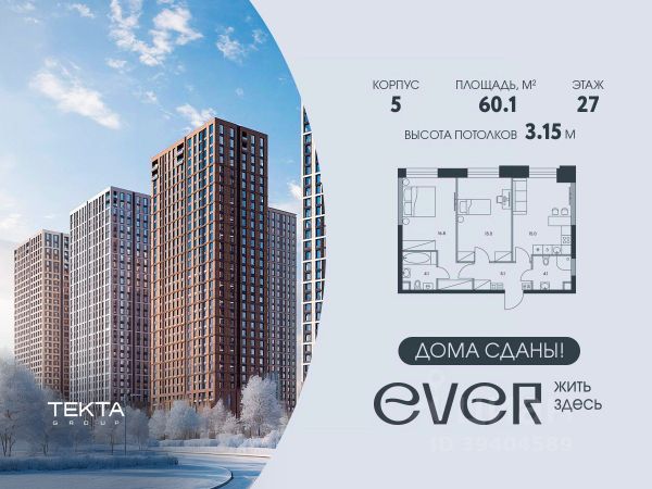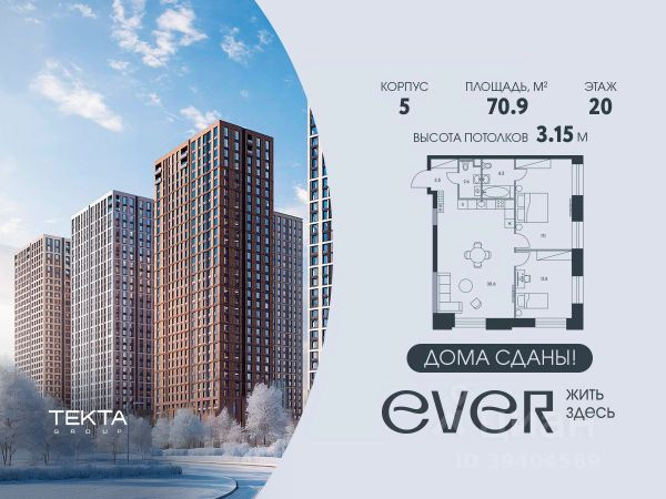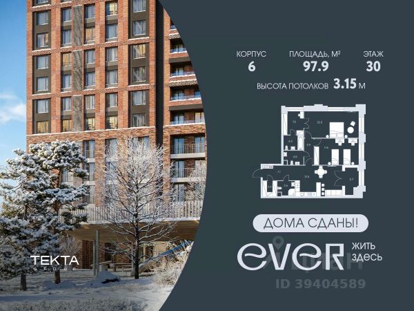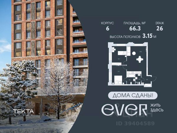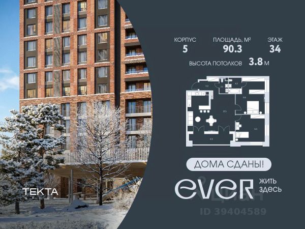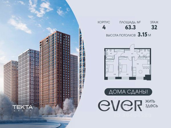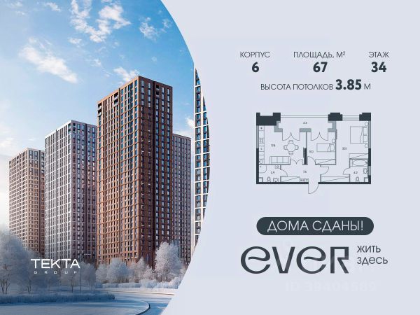 3-комн. квартира в ЖК "Ever" на 34 этаже в 34 этажном здании Корпус 4. Общая площадь: 66.6 кв.м., жилая: 48.1 кв.м. Высота потолков 3.85 м.