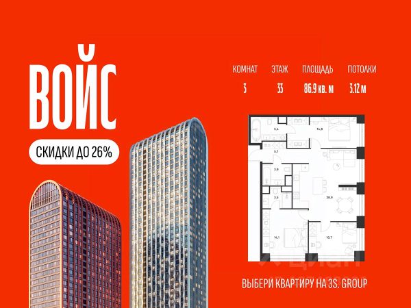 Ипотека от 3,5% на весь срок. Дополнительная скидка в офисе продаж! Продается уютная 3-комн. квартира площадью 69,7 кв.м на 12 этаже жилого комплекса бизнес-класса Войс. Общая площадь: 69,7 кв.м., жилая: 50,6 кв.м., площадь кухни-гостиной: 18,5 кв.м., высокие потолки: 3,12 м., санузел совмещенный. О проекте: Войс. Высокие стандарты жизни Мы уверены, что высокие идеалы неизменно помогают достигать высот. Создавая Войс, мы ориентировались на людей с высокими требованиями к качеству и безупречным вкусом. Башни жилого комплекса, сочетают элегантную форму с динамичной геометрией фасадов, устремляются ввысь и отвечают самым высоким стандартам строительства. Технологичность, воплощенная в архитектуре - это ваш, собственный Войс. Преимущества локации Близость к метро Текстильщики, БКЛ и МЦК Новохохловская (10 мин) Рядом природный заповедник и конно-спортивная база Кузьминки-Люблино Будущее окружение Проект Южный порт - Текстильщики с деловым центром Сити-2 Небоскребы высотой до 300м Культурный центр с амфитеатром Променад вдоль Москвы-реки и яхт-клуб Архитектура Проект от Архитектурной мастерской Алексея Ильина Две перпендикулярные башни с арочными вершинами Высокая башня: светло-серый металл Низкая башня: терракотовая керамика Благоустройство Внешняя зона: парковки, магазины, кафе Внутренний двор: закрытая территория с озеленением Шумозащитный экран Сезонное озеленение Встречи на высоте Гранд-лобби высотой 8м Дизайнерская мебель Умные скоростные лифты Услуги Детский центр с игровой зоной Фитнес-студия для жителей