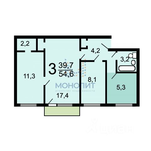 Общая площадь: 56.70 м.кв., Жилая площадь: 41.00 м.кв., Площадь кухни: 6.00 м.кв.