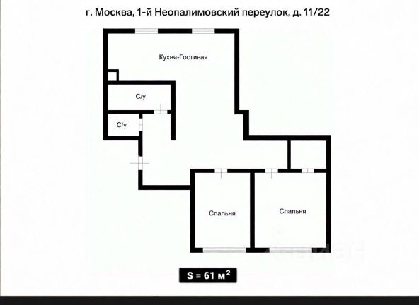 Общая площадь составляет 59.4 м², жилая ~ 40.5 (14.9+15.5+10.1) м², кухня ~ 6.4 м². Высокие трехметровые потолки! Окна выходят на северо-восток.