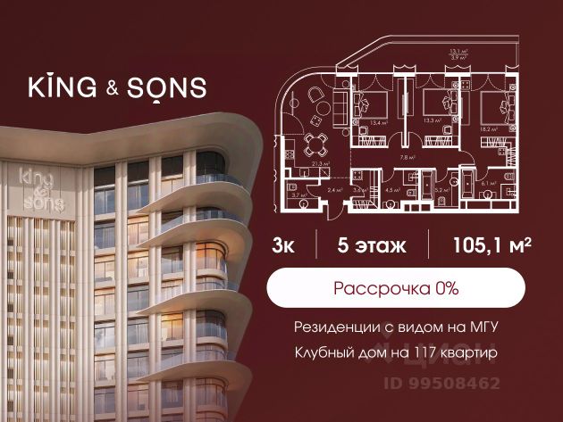 Светлая квартира общей площадью 83 м2 на 4-м этаже премиального жилого комплекса Legacy, расположенного в прекрасном зеленом районе Раменки. Отличная функциональная планировка: кухня-гостиная, 2 мастер-спальни со своими с/у и продуманной гардеробной зоной; гостевой санузел и просторный холл, который с первых шагов погружает в безупречное пространство изысканности и уюта. Жилое пространство спроектировано для исключительно комфортной жизни с возможностью реализации уникального дизайн-проекта. Для удобства будущих резидентов доступны два варианта отделки от застройщика: Premium и Elite премиальные материалы в отделке, мебель от европейских производителей, и освещение индивидуального изготовления. Жилой комплекс Legacy располагается на Мичуринском проспекте в районе с развитой инфраструктурой, богатой историей и высокой транспортной доступностью. Москва-река, Ботанический сад МГУ, главный корпус МГУ и Воробьевы горы на расстоянии прогулки от комплекса. Проект состоит из 9 секций переменной этажности от 8 до 17 этажей. В каждой секции не более 5 квартир на этаже, что обеспечивает высокий уровень приватности. Архитектура Проект Legacy разработан архитектурным бюро Speech. Его строгая лаконичность дополнена современными стандартами роскошной и комфортной жизни это бессменная классика, которая всегда вне моды. Благоустройство Свой приватный двор-сквер площадью 3 600 м2 с пространствами для всех возрастов: на территории располагаются игровые площадки, детский городок, песочница, воркаут-зоны, батуты, места для отдыха, лабиринты, настольный теннис и шахматные столы. Презентабельные лобби Дизайнерские лобби и холлы с премиальной отделкой. Изысканный стиль и высококачественные европейские материалы, отражающие высокий статус резидентов дома. Инфраструктура в доме Магазины, салон красоты, спортивная студия на первом этаже. А также ресторан Seasons, который позволяет разнообразить рацион и сделать каждый ужин особенным. Комфорт и безопасность Премиальный консьерж-сервис 24/7, круглосуточная охрана, видеонаблюдение, система СКУД, закрытый охраняемый паркинг и эксклюзивное мобильное приложение для решения бытовых вопросов резидентов.