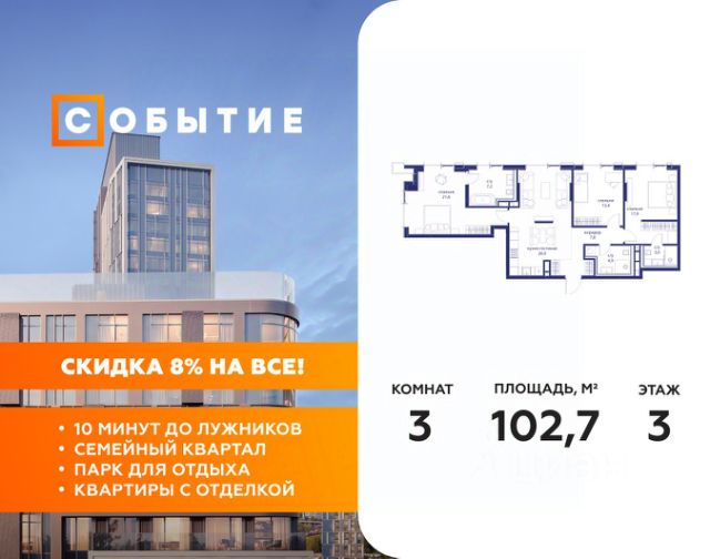 СОБЫТИЕ.6 — финальный дом парк-квартала СОБЫТИЕ на Мосфильмовской. Переезжайте в уже сформированный квартал с готовой инфраструктурой и парком! Премиальный жилой комплекс в престижном районе Москвы предлагает стильную архитектуру, продуманное благоустройство и великолепно разнообразие общественных пространств. Свой парк прямо возле дома!
