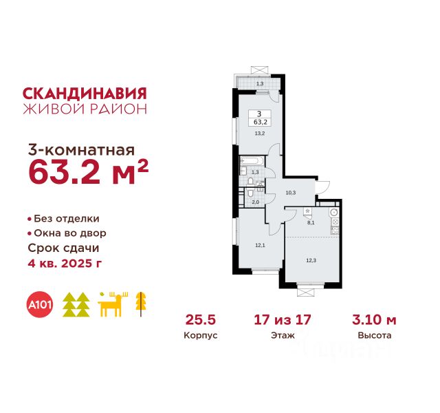 Продается трехкомнатная квартира 489 в новостройке Жилой район "Скандинавия" по адресу Москва, ТиНАО, Новомосковский АО, Сосенское С/П, Коммунарка пос., жилой комплекс Скандинавия, 37.2.3, район Коммунарка, Новомосковский административный округ, Москва. Общая площадь квартиры - 68.60 кв. м., этаж 12 из 18, секция 3. Тип проекта, по которому построен дом - монолит, компания-застройщик - ООО "А101". Стоимость квартиры - 25705792 Р. Срок сдачи - 1 квартал 2026. ПРЕДЛОЖЕНИЯ ОТ ЗАСТРОЙЩИКА В НОЯБРЕ 2025: Ипотека от 13,9 % для всех! На весь срок. "Семейная ипотека" вернулась. Ставка от 3,5 % на весь срок! Без удорожания! Выгодное ипотечное комбо: Ипотека от 2200 р./мес. и от 6 % после рождения ребёнка! Ипотека для всех "Держи пять!" - ставка 5 % на 2 года! *более подробную информацию по скидкам и акциям уточняйте в отделе продаж ЖК "Скандинавия" на границе Бутовского лесопарка (1610 га) - это баланс качественного жилья и сервисов, зелёных пространств для активного и созерцательного отдыха. Выразительная архитектура и цветовая гамма монолитных корпусов комфорт- и бизнес-класса (8-17 этажей) созвучны скандинавским мотивам, органично интегрированы в великолепный природный контекст. Огороженные дворы свободны от машин, в них продуманы места для отдыха и работы на свежем воздухе, озеленение, детские и спортивные площадки. Для прогулок, встреч и районных праздников - площадь Туве Янссон с "сухим" фонтаном, вековыми дубами и единственным в мире памятником писательнице; пешеходный променад 2 км; 3 крупных природных ручья; более 15 км велосипедных и прогулочных дорожек с арт-объектами. Инфраструктура района включает современные школы и детские сады, центр впечатлений, фитнес-клубы, развивающие и творческие центры, магазины, кафе, салоны красоты. На подземных этажах - паркинги и кладовые. Преимущества "Скандинавии": - ст. метро "Потапово" - 100 м от ближайших домов (открыта!) - удобные выезды на трассу Солнцево - Бутово - Варшавское шоссе и ул. Бачуринская - свои школы и детские сады - инфраструктура на первых этажах и рядом с домом - лесопарк, природные водоёмы, прогулочные маршруты