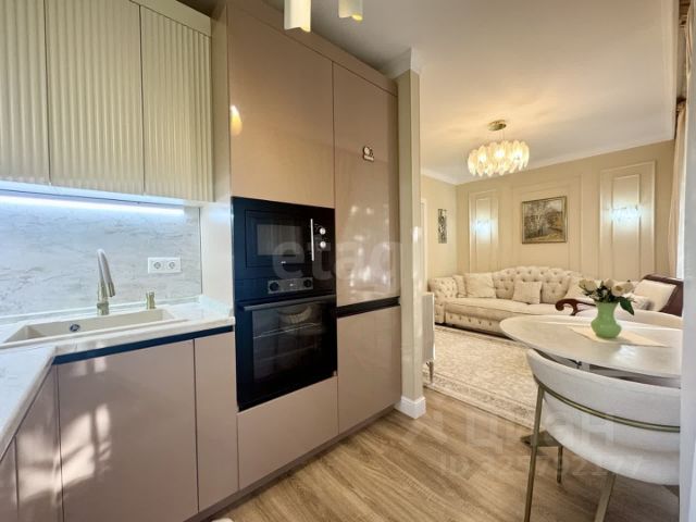 Кухня-гостиная: современная встраиваемая кухня с качественной фурнитурой, холодильник, посудомоечная машина, индукционная панель, духовой шкаф с микроволновкой, мощная вытяжка, диван, стол и стулья, зона TV
