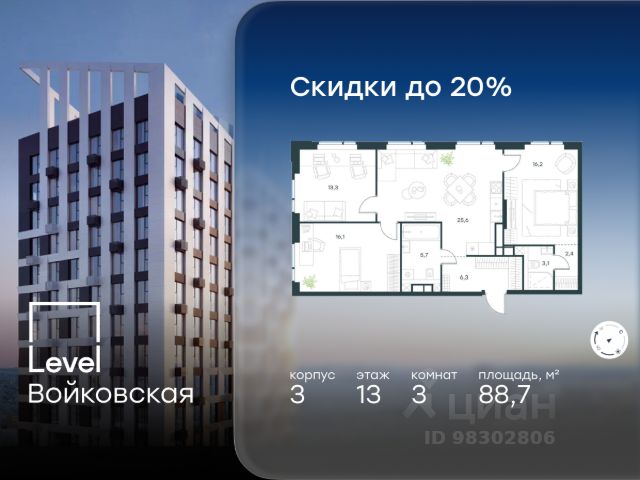 Цена указана с учётом скидки при 100%-й оплате, несубсидированной ипотеке, рассрочке (кроме программы "Рассрочка 0%"). Продается 3-комнатная квартира площадью 88.60 кв. м без отделки. Квартира находится на 14 этаже 20-этажного корпуса 5, в новом жилом комплексе бизнес-класса Level Войковская, расположенном рядом с живописным заповедником "Покровское-Стрешнево" (застройщик - компания Level Group/Левел групп). Прекрасная транспортная доступность - 7 мин. пешком до станции МЦК "Балтийская"; - 15 мин. пешком до станции метро "Войковская"; - 8 мин. на машине до ТТК; - 15 мин. на машине до центра Москвы; - 20 мин. на машине до Москва-Сити. Продуманный архитектурный проект - стильная архитектура от мастерской Фефелова В. В.; - панорамные виды на парки, Химкинское водохранилище и Останкинскую башню; - лобби с высотой потолков до 6,45 метров; - более 20 видов планировочных решений, включая редкие форматы квартир с террасой и увеличенной высотой потолков до 5,42 метров; - 2 варианта дизайнерской отделки в корпусе 4, предлагаются как дополнительная опция к отделке white box: стиль Modern в светлых холодных тонах и стиль Classic в нейтральной бежевой гамме. Квартиры в корпусах 3 и 5 сдаются без отделки. Расположение Level Войковская строится в престижном Северном округе Москвы. Развитая инфраструктура и живописная природа переплетаются в единый ансамбль, столь значимый для комфортной жизни. Войковский район окружают парки и набережные. В шаговой доступности - парк "Покровское-Стрешнево", не более 15-ти минут на велосипеде занимает путь до Тимирязевского парка и 9-ти минут до парка усадьбы Михалково. Рядом более 60 школ, 75 дошкольных учреждений, 17 государственных и 6 частных вузов, 25 супермаркетов, 4 торговых центра, среди которых ТЦ "Метрополис" и ТЦ "Авиапарк". Внутренняя инфраструктура На территории жилого комплекса предусмотрены коммерческие помещения: кафе, ресторан, пекарня и другие сервисы откроются на первых этажах корпусов. Для жителей будет доступен отапливаемый подземный паркинг на 244 машино-места с доступом с любого этажа на лифте. На территории паркинга будет расположено 125 кладовых помещений для хранения сезонного инвентаря. Лобби и благоустройство Дизайн лобби Level Войковская создан совместно с бюро BLANK. Это уютные гостиные, где хочется задержаться. Теплая цветовая гамма, ресепшен, зоны ожидания, лапомойки и гостевые санузлы - каждая деталь превращает лобби в комфортное продолжение вашего дома. 1,15 га площади в первых двух этапах строительства отведено под приватный внутренний двор, который спроектирован совместно с бюро "Правда". Детские площадки для всех возрастов, спортивные пространства для йоги, воркаута и петанка, уютные зоны для тихого отдыха или работы. Здесь утро начинается с вдохновения, а вечер наполнен приятными моментами. Лифты Комфортное перемещение внутри жилого комплекса будут обеспечивать надёжные лифты с доступом в паркинг с жилых этажей. В каждом корпусе предусмотрено по 3 грузопассажирских лифта.