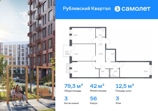 Предлагается 3-комнатная квартира комфорт-класса 79,3 кв.м в корпусе 56 на 3 этаже, в ЖК "Рублевский Квартал" Квартира с чистовой отделкой. Доступность дополнительных опций уточняйте у застройщика. Приобрести квартиру возможно по специальным акциям от застройщика, с текущими условиями акций можно ознакомиться в блоке "Акций". Цена динамическая и может отличаться, уточняйте актуальность у застройщика. Жилой комплекс "Рублевский Квартал" на западе Москвы окружен Подушкинским и Дубковским лесами. Рядом ж/д станция Усово и МЦД-1 "Одинцово". На территории комплекса — школа, детский сад, поликлиника и торговый центр. Архитектура с переменной этажностью от 3 до 12 этажей гармонично вписывается в природу. Закрытый двор-парк, кленовые аллеи и игровые зоны создают уют. Квартиры с отделкой и живописными видами на лес.