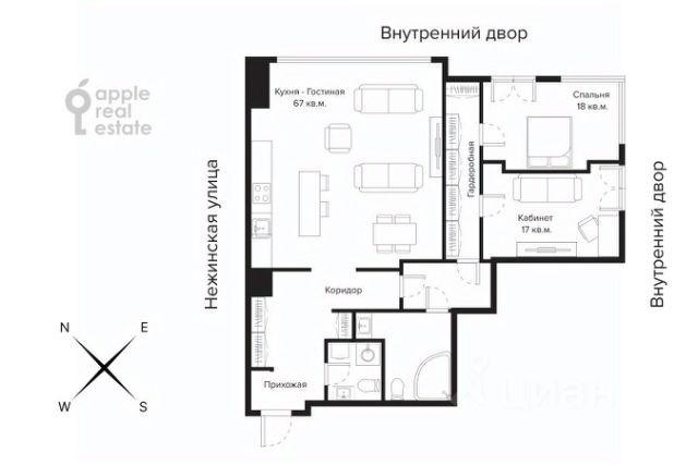 План: кухня-гостиная с выходом на большую лоджию, две спальни (одна из них - с выходом на вторую лоджию), два с.у., гардеробная. Ориентация окон: гостиная на северо-восток, кухня - на северо-запад, спальная и детская - на юго-восток, вход - на юг. Высота потолков 3 м.