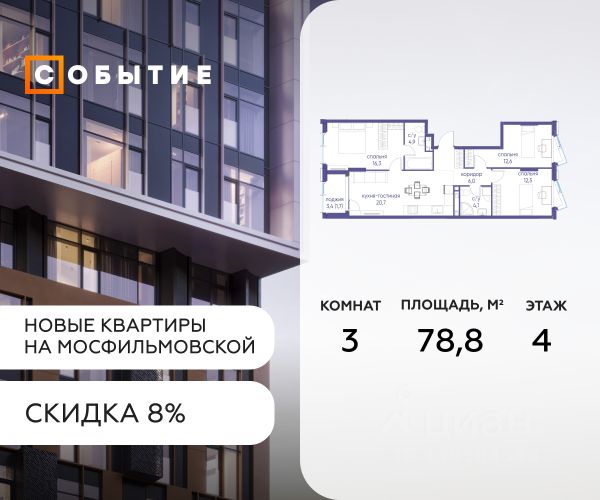 Около 10 минут до Москва Сити и ТТК! В продаже 3-к квартира от застройщика. Общая площадь 76, жилая 20.9, кухня 55.1. Квартира расположена на 7 этаже жилого квартала "Событие-6", корпус 2, Секция 4. Квартира без отделки. Срок сдачи: 4 кв. 2029 года. СОБЫТИЕ.6 — финальный дом парк квартала СОБЫТИЕ на Мосфильмовской, созданный для тех, кто хочет "заняться жизнью" здесь и сейчас и получать максимум от каждого дня. Стильная архитектура, продуманное благоустройство и богатый набор общественных пространств делают дом естественной сценой для ярких личных событий. Архитектура от бюро Atrium на базе дизайн кода британских LDA Design и UHA London. Лучшая новостройка страны 2025 года! Расположение: • Около 7-10 минут пешком до станций метро "Аминьевская" и "Мичуринский проспект" (в зависимости от маршрута) • Около 15 минут до Садового кольца • Около 25 минут до аэропорта Внуково • Рядом — ключевые магистрали (Кутузовский, Мичуринский, Ломоносовский проспекты, Аминьевское шоссе), что упрощает выезды как в центр, так и за город Инфраструктура "всё у дома" Главный центр притяжения — модный парк "Событие" от бюро Wowhaus. Благоустроенный бульвар и рекреационные зоны занимают около половины территории квартала, а природная часть парка площадью более 12 гектаров уже открыта. В парке проложены: • примерно 1,5 км беговых дорожек • около 2,7 км велодорожек • около 1,6 км экотропы • детские и спортивные площадки, места для пикника, лекторий, декоративный огород, восстановленные биотопы • Парк "Событие" — финалист конкурса Правительства Москвы в номинации "Строительство парков и общественных пространств" Мультидвор Двор СОБЫТИЯ.6 — это мультимодальное пространство для жителей всех возрастов. Здесь предусмотрены: • игровые и развивающие площадки для малышей и детей постарше • воркаут зоны, площадки для игр с мячом и йоги для активных взрослых • мини бульвар с фонтаном для прогулок • террасы, амфитеатры и лаунжи для спокойного отдыха и встреч • Комьюнити террасы и общественные пространства на кровле 10 этажа Внутри дома предусмотрен полный набор общественных пространств: • детская игровая комната и детский клуб • спортрум / фитнес рум • коворкинг и комнаты для занятий с репетитором • дизайнерские лаунж зоны для деловых и личных встреч Район и окружение: парки, университеты, спорт Район относится к числу самых экологичных в Москве: он буквально утопает в зелени парков и заповедников. В окружении — парк "Событие", природный заказник "Долина реки Раменки", Воробьевы горы, Матвеевский лес, парк 50 летия Октября, парк Олимпийской деревни, Вороновский парк, набережные Москвы реки, заказник "Долина реки Сетунь". Это настоящая "интеллектуальная миля" Москвы: рядом МГУ имени М. В. Ломоносова, ботанический сад МГУ, театр им. Н. И. Сац, Новодевичий монастырь, стадион "Лужники", Парк Победы и другие знаковые объекты. Район особенно комфортен для сторонников ЗОЖ: множество мест для бега, велопрогулок, спорта на открытом воздухе и занятий