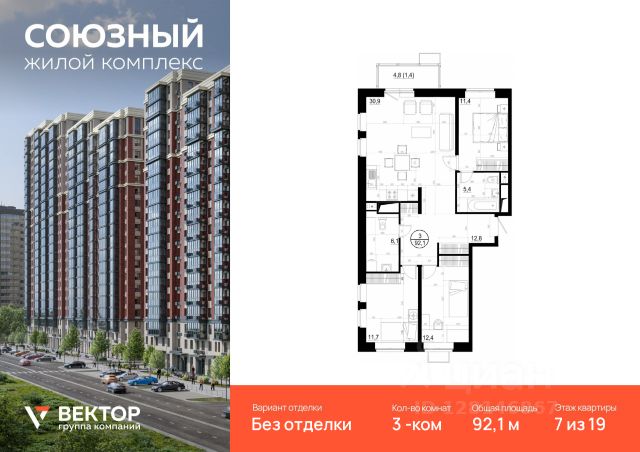 Продается 3-комн. квартира площадью 92,1 кв.м на 7 этаже 19 этажного дома в ЖК "Союзный" от федерального девелопера ГК "Вектор". Жилой комплекс "Союзный" - это квартал из 6 монолитных домов комфорт-класса высотой до 25 этажей. Добраться до столицы из "Союзного" удобно как на автомобиле, так и на общественном транспорте. В трех минутах ходьбы от комплекса находится автобусная остановка, откуда ходят маршруты до станций метро "Киевская", "Парк Победы" и "Юго-Западная". До станции МЦД-1 "Одинцово" можно дойти пешком за 15 минут или доехать на наземном транспорте за то же время. Автовладельцы за 20 минут доберутся до МКАД по Северному обходу Одинцово, Боровскому, Минскому и Можайскому шоссе. Территория жилого комплекса включает детский сад на 245 мест (срок сдачи — 4 квартал 2025 года), торгово-развлекательный центр, поликлиники, спортивный парк и многоуровневые паркинги: открытый, подземный и комбинированный с эксплуатируемой кровлей. Во дворах обустраиваются игровые комплексы с безопасным покрытием, спортивные площадки, зоны отдыха для взрослых и площадки для занятий йогой. Озеленение территории включает деревья, кустарники и газоны. На первых этажах домов предусмотрены коммерческие помещения, где смогут открыться магазины, сервисные службы, кафе, фитнес-студии и салоны красоты. В шаговой доступности уже работают детские сады, школы, медицинские учреждения, аптеки, супермаркеты, банки, кафе и торговые центры. Недалеко находятся кинотеатр "Юность", Ледовый дворец, сквер Союзный и Глазынинский пруд с прогулочной зоной, качелями и спортивными площадками. Проект "Союзного" разработан российским архитектурным бюро MEZON PRO — лауреатом престижных премий "Urban Awards", "Золотое Сечение", "Лидер рынка недвижимости" и "Green Zoom". Дома строятся по монолитно-кирпичной технологии с использованием керамического кирпича для фасадов. В просторных холлах предусмотрены большие окна, создающие естественное освещение. В каждом корпусе запроектировано три лифта: один пассажирский и два грузопассажирских, что обеспечивает комфорт при переезде и повседневном использовании. Ассортимент квартир включает студии, одно-, двух-, трех- и четырехкомнатные варианты свободной планировки площадью от 24,5 до 88,1 кв. м. Есть решения с лоджиями, двумя санузлами и разной ориентацией окон — во двор или на улицу. Высота потолков в стандартных квартирах составляет 2,8 м, в отдельных вариантах — до 4,7 м. Покупателям предлагаются разные варианты отделки: предчистовая, позволяющая самостоятельно выбрать стиль интерьера, и готовые дизайнерские решения "под ключ". Жилой комплекс "Союзный" расположен в городе Одинцово Московской области, всего в 8 км от МКАД. Район отличается благоприятной экологией: Одинцовский округ удостоен медали "Экологически чистый район" и внесен в официальный Реестр экологически чистых территорий.