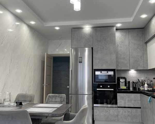 * Кухня-гостиная = 22.6 кв.м. - ВСТРОЕННЫЙ кухонный гарнитур со всей необходимой техникой (вкл. ПОСУДОМОЕЧНУЮ машину (60 см.), холодильник, СВЧ, духовой шкаф, ИНДУКЦИОННУЮ варочную панель) под ЕДИНОЙ столешницей (искуственнный КАМЕНЬ, БОЛЬШАЯ рабочая зона с подсветкой по периметру); столовая (обеденный стол, стулья) и зона отдыха (мягкий раскладной диван напротив ЖК-телевизора), КЛАДОВАЯ;