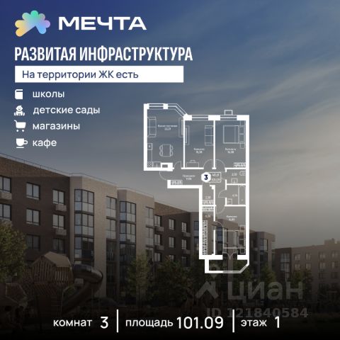 СТАРТ ПРОДАЖ! Рассрочка 0% от застройщика! Продается трехкомнатная квартира в квартале "Любовь" жилого комплекса "Мечта". Общая площадь квартиры: 92.69 кв. м, этаж 2 из 5. Заселение: 2 квартал 2028 г. Отделка: Чистовая ОСОБЕННОСТИ: - Просторная кухня-гостиная - Продуманная планировка - 3 спальни - 2 санузла - Высота потолка: 2.7 метра Жилой комплекс "Мечта" расположен в 23 км от МКАД по Дмитровскому или Ленинградскому шоссе. ТРАНСПОРТНАЯ ДОСТУПНОСТЬ: - 15-20 минут на общественном транспорте до МЦД-1 "Лобня" - 30-35 минут на общественном транспорте до метро "Физтех" - 45-50 минут до станций метро "Савеловская" или "Белорусская" - 30 минут на автомобиле до Москвы Квартал "Любовь" создан для тех, кому стало тесно в рамках стандартного жилья. Здесь учтены все запросы к современному комфорту: продуманные планировки, балконы, эркеры и лифты в малоэтажных домах. Инфраструктура включает в себя муниципальную школу и детские сады, кабинет врача общей практики, множество кафе и ресторанов, а также различные спортивные и детские площадки. В пешей доступности от жилого комплекса расположены лес и три реликтовых озера — Долгое, Круглое и Нерское, а также реки Альба, Уча и Волгуша. Территория жилого комплекса закрыта для посторонних, находится под охраной и патрулируется. На въезде расположен КПП. Камеры видеонаблюдения работают круглосуточно на всей территории. Вы и ваши дети будете чувствовать себя в безопасности.