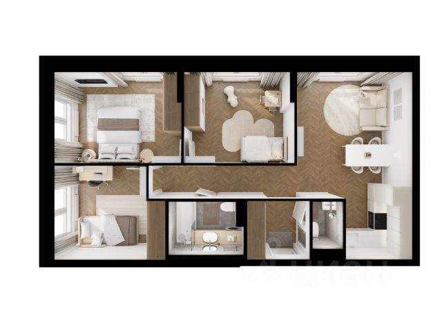 Кухня- гостиная площадью 24 кв. м оборудована всей необходимой современной техникой: посудомойкой, холодильником, духовым шкафом с функцией пароварки, электрической плитой, кофемашиной и вытяжкой. Просторная рабочая зона дополняется обеденной зоной с раскладным столом и стульями, а также зоной для отдыха с мягким раскладным диваном. Квартира включает три изолированные спальни, в одной из которых оборудована гардеробная, а также два санузла, один из которых с душевой кабиной.