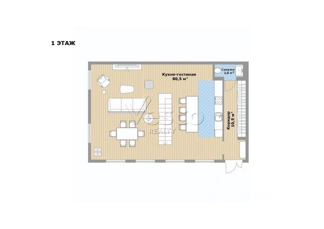 Объединенная кухня-столовая-гостиная с 6-тью окнами (80.5).
