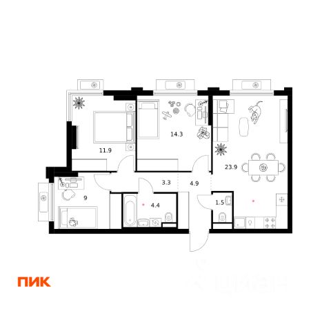 Общая площадь: 113.00 м.кв., Жилая площадь: 50.00 м.кв., Площадь кухни: 25.70 м.кв., Кухня-гостинная