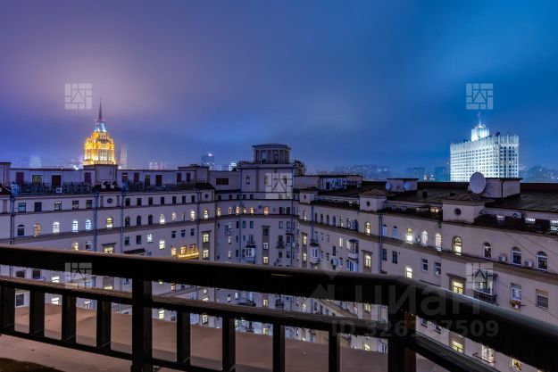 Арочные панорамные окна открывают длинные виды на *Москва-Сити, Саввинскую набережную и Москву-реку* - редкая комбинация направлений для дома Brodsky.