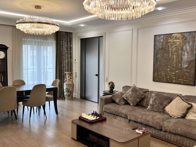 Использованы качественные материалы: инженерная доска из дуба, кварц и мрамор на столешницах, лепнина, деревянные подоконники. Столярные изделия на заказ. Толстые тяжёлые двери высотой 2.70.