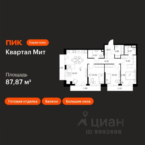 Продаётся 3-комн. квартира площадью 76,41 кв.м на 25 этаже 32 этажного дома (Корпус 3.4, Секция 4) проекта ПИК Квартал Мит. Светлый просторный подъезд на уровне земли, функциональная планировка, большие окна, c отделкой. "Квартал Мит" строится в экологически чистом районе Митино, где по соседству расположен большой лесопарк, а с двух сторон протекают реки Сходня и Журавка. Для семей с детьми здесь появится школа и два детских сада. В 20 минутах пешком находится станция метро "Пятницкое шоссе", а за 10 минут на автомобиле можно доехать до МКАД. Архитектура от архитектурного бюро "Слава+" Концепция квартала сочетает эстетику и функциональность. Башня-доминанта цвета красной охры и разновысотные корпуса терракотового, белого и графитового оттенков формируют узнаваемый силуэт современного городского пространства. Просторные террасы, разнообразные балконы и окна в пол придают облику динамичность и дарят квартирам уютные места для отдыха. Первые этажи с панорамными окнами создают сцену для яркой городской жизни. Здесь появятся пространства для прогулок, летние террасы, рестораны и коммерческие помещения. Комфорт "Серии плюс". При входе в дом жителей встретят светлые просторные лобби с высокими потолками — попасть сюда можно как со стороны улицы, так и со двора. В лобби будет зона ожидания, велосипедная и колясочная. Быстро и с комфортом подняться на нужный этаж помогут бесшумные скоростные лифты. На подземном этаже появится паркинг и индивидуальные кладовые, где удобно хранить сезонные вещи. Артикул 1034975 (Застройщик АО СЗ "ПФК")