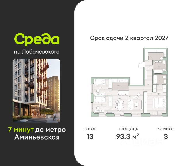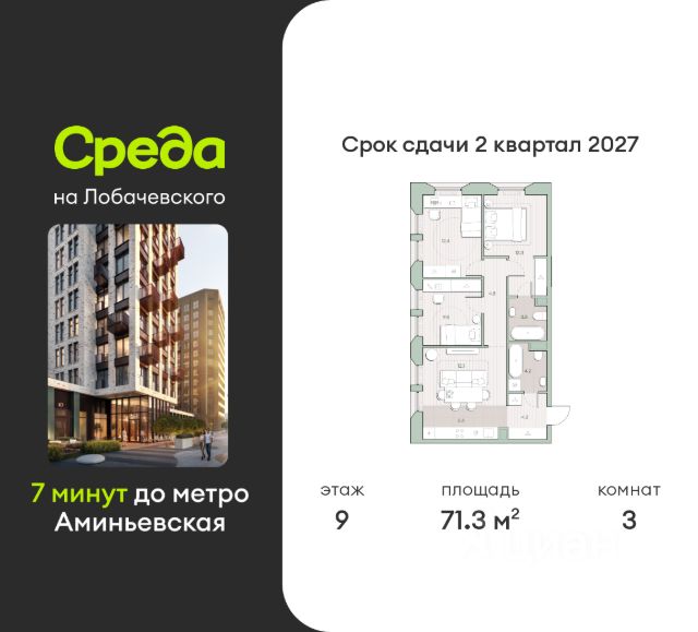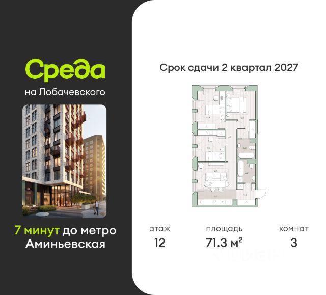 О квартире Продаётся 3-комнатная квартира общей площадью 71.3 кв.м. с отделкой white box. Квартира расположена на 12 этаже корпуса 5.3 в жилом комплексе бизнес-класса "Среда на Лобачевского" в пешей доступности от метро "Аминьевская". О жилом комплексе "Среда на Лобачевского" полностью соответствует критериям современного жилого пространства. Взяв за основу рациональный подход, мы гармонично соединили дизайн, актуальные тренды и функциональность. Продуманный современный экстерьер и функциональные планировки внутри, приватные пространства и разнообразные досуговые зоны для каждого члена семьи — все это "Среда на Лобачевского". Инфраструктура Район отлично развит и наполнен жизнью, здесь уже есть вся необходимая инфраструктура — детские сады, школы, медучреждения, торговые центры, благоустроены парки для прогулок и отдыха, удобен и легкодоступен городской транспорт. Рядом расположены учебные корпуса крупных университетов — МГУ, МГИМО и РАНХиГС. Школы и детские сады в районе занимают высокие позиции в городских рейтингах, поэтому вам не придется беспокоиться о качестве образования детей. Как и об отдыхе: поблизости расположены живописные пруды, реки и парки. Это Парк Олимпийской деревни, Парк имени 50-летия Октября, Мещерский парк и Очаковские пруды. Теперь поставить галочки в еженедельном чек-листе "спорт-прогулки-встречи с друзьями" можно, не покидая любимый район. Особенности Особое внимание в проекте уделяется созданию функциональных пространств не только внутри дома, но и за его пределами. В ландшафтном парке "Среды на Лобачевского" расположены крытые зоны для спокойного времяпровождения, места для активного отдыха и спорта, коворкинг, соседский комьюнити-центр, водные объекты. —Ландшафтный парк во дворе. —Водный сад с зонами отдыха. —Зоны коворкинга. —Дизайнерские гранд-лобби. —Бесключевой доступ. —Подземный паркинг.