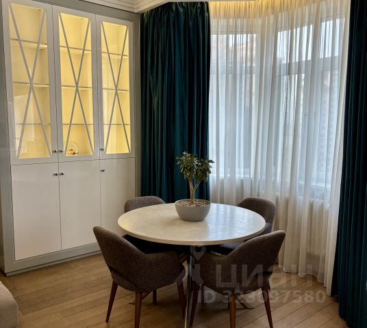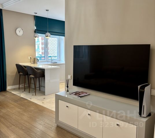 - Просторная кухня-гостиная с потрясающим видом на ЖК, оборудована стильной и современной TV панелью Presotto с полками для книг, электрическим камином и диваном премиального производителя Baxter