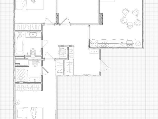 Две изолированные комнаты (14,1 и 15,4 м2), раздельные просторные туалет и ванная, большой коридор, в коридоре есть вместительный шкаф и место для обуви.