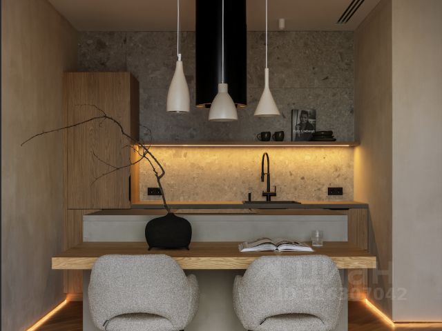 Кухня с премиальной техникой Neff (холодильник, варочная панель, духовка, посудомоечная машина, стиральная машина), предусмотрен хозяйственный шкаф для хранения гладильной доски, утюга, мелкой бытовой техники).