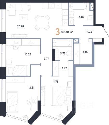 Продаётся 3-комнатная квартира в строящемся доме (ГОЛД), срок сдачи: IV-кв. 2027, общей площадью 80.38 кв.м., на 16 этаже.