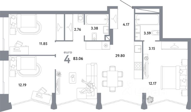 Продаётся 3-комнатная квартира в строящемся доме (ГРИН), срок сдачи: IV-кв. 2027, общей площадью 83.06 кв.м., на 27 этаже.