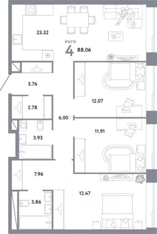 Продаётся 3-комнатная квартира в строящемся доме (ГРИН), срок сдачи: IV-кв. 2027, общей площадью 88.06 кв.м., на 30 этаже.
