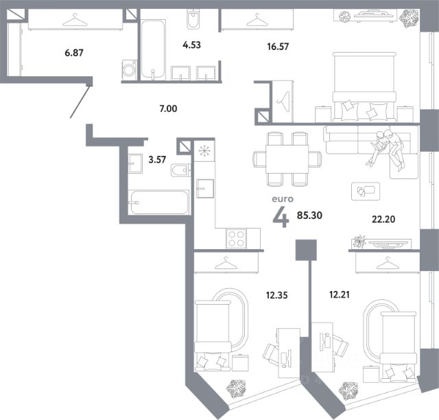 Продаётся 3-комнатная квартира в строящемся доме (ГОЛД), срок сдачи: IV-кв. 2027, общей площадью 85.3 кв.м., на 12 этаже.