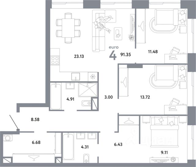 Продаётся 3-комнатная квартира в строящемся доме (ГОЛД), срок сдачи: IV-кв. 2027, общей площадью 91.35 кв.м., на 15 этаже.