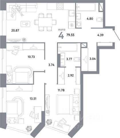 Продаётся 3-комнатная квартира в строящемся доме (ГОЛД), срок сдачи: IV-кв. 2027, общей площадью 78.4 кв.м., на 21 этаже.