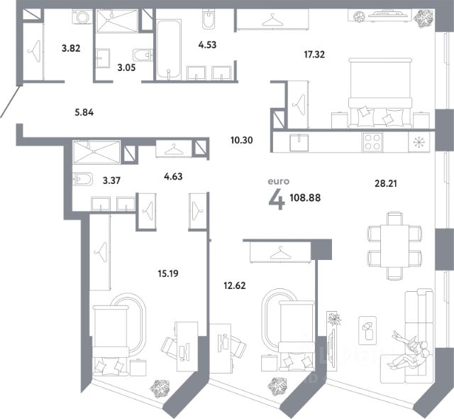 Продаётся 3-комнатная квартира в строящемся доме (ГРИН), срок сдачи: IV-кв. 2027, общей площадью 103.89 кв.м., на 18 этаже.
