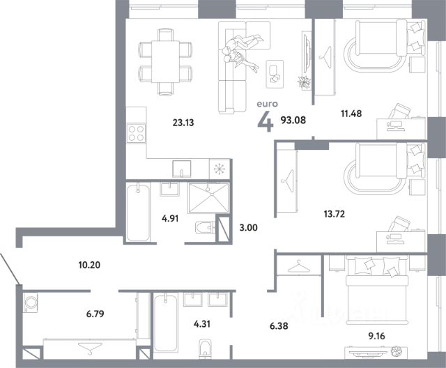 Продаётся 3-комнатная квартира в строящемся доме (ГОЛД), срок сдачи: IV-кв. 2027, общей площадью 93.08 кв.м., на 17 этаже.