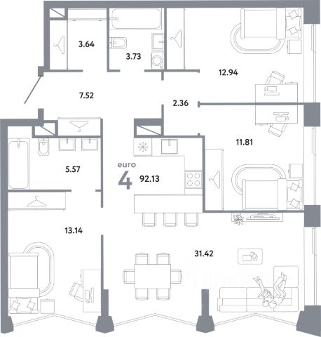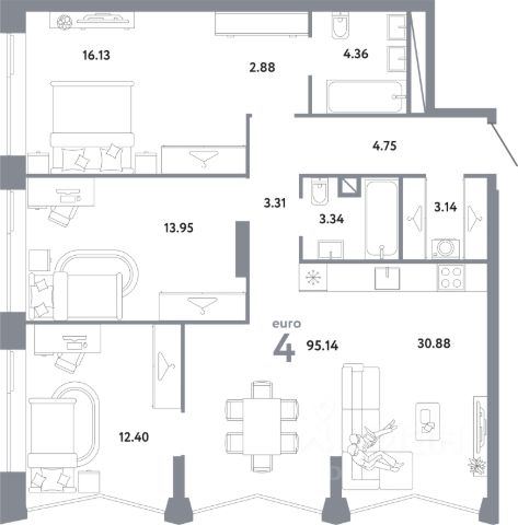 Продаётся 3-комнатная квартира в строящемся доме (ГОЛД), срок сдачи: IV-кв. 2027, общей площадью 95.14 кв.м., на 22 этаже.