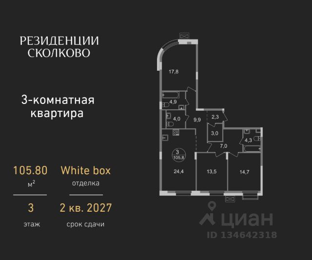 Продается трехкомнатная квартира в девятиэтажном монолитном доме жилого комплекса "Резиденции Сколково". Общая площадь квартиры - 96,8 кв. м, этаж 4 из 9. Срок сдачи - 3 квартал 2026 года. Квартира реализуется с одним из пяти видов отделки на выбор: - White-box - это возможность создать уникальный интерьер вашей квартиры, выбирая финальные отделочные материалы и мебель по вашему вкусу. - Лаконичный минимализм (Bussines либо Bussines Plus) - характеризуется мягкими натуральными цветами, высокой функциональностью, лаконичностью и комфортом. - Французская классика (Bussines либо Bussines Plus) - сдержанность цветовых решений и отсутствие броских деталей формируют чистое пространство, которое позволяет вам придать интерьеру индивидуальный стиль при помощи дополнительных элементов, ознакомиться с примером визуализации вы можете благодаря 3D туру в галерее. ЖК "Резиденции Сколково" - это современный проект бизнес-класса, расположенный в престижном районе Сколково, у западной границы Москвы. Транспортная доступность: - 0 км от МКАД - 10 минут на личном авто до метро "Озёрная" Солнцевской линии - 15 минут на личном авто до Москва-Сити по Кутузовскому проспекту - 20 минут на личном авто до центра по проспекту Генерала Дорохова - 24 минут на личном авто до центра по Мичуринскому проспекту Безопасность: Огороженная, закрытая территория, круглосуточное видеонаблюдение, контроль доступа во внутренний двор. Благоустройство и инфраструктура: Масштабное озеленение в концепции "двора-парка" и множество площадок отдыха для взрослых и детей. В 5 минутах ходьбы расположен Мещерский лесопарк. В жилом комплексе уже построены и работают 2 муниципальных детских сада с бассейном, планируется строительство 1 школы. В непосредственной близости - частные и муниципальные детские сады и школы, кафе и рестораны, продуктовые магазины, салоны красоты и другие готовые объекты городской инфраструктуры. Авторская архитектура: Авторская концепция архитектуры: панорамное остекление, французские балконы, стильные просторные лобби. Входные группы на уровне земли. Для удобства жителей на первых этажах предусмотрены помещения для колясок и на -1 этажах для хранения велосипедов.
