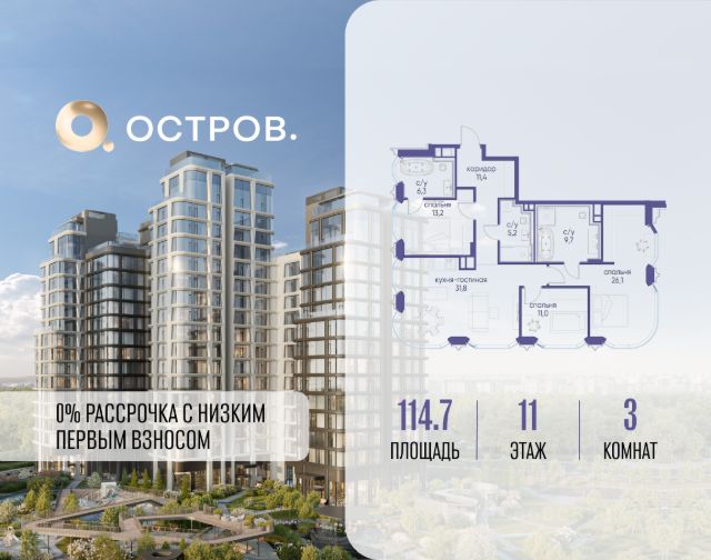 Продаётся трехкомнатная квартира от застройщика: общая площадь 126.00 м², жилая 44.90 м², кухня 42.30 м², 21, жилой квартал "Остров 7", корпус 7 (7 квартал) (секция 1). срок сдачи: 4-кв. 2025. , 3 санузла: 1 раздельный и 2 совмещенных. В жилой зоне 2 больших окна на одну сторону, хорошая инсоляция. Позвоните сейчас и забронируйте квартиру! Купите квартиру в доме у прибрежного парка, в квартале ОСТРОВ.7. Это семь корпусов премиум- и бизнес-класса в одном из лучших мест ОСТРОВА - между бульваром и парком, поблизости от реки. Стильные корпуса имеют узнаваемый вид благодаря бионической пластике фасадов, приподнятых над землей. Для жителей предусмотрены детский клуб, фитнес-рум, коворкинг, переговорные, лаунжи. На крышах устроены видовые общественные пространства с зонами для отдыха и спорта. Двор расположен на двух уровнях: нижний ландшафтный парк и верхняя городская терраса. ОСТРОВ.7 - часть жилого комплекса на западе Москвы, в 15 минутах езды от центра. Это настоящий заповедник посреди большого города, в окружении реки и 650 га заповедников. Здесь все необходимое находится по соседству: от детского сада до супермаркета, от фитнес-зала до серфинг-центра. На территории созданы все условия для отдыха и общения: клубная инфраструктура в домах и дворы-парки, набережные и променады, маршруты для спортсменов, детей и возрастных жителей. В нескольких минутах ходьбы расположена станция метро "Терехово" БКЛ. На автомобиле - 10 минут до Москва-Сити и 15 минут до Садового кольца.